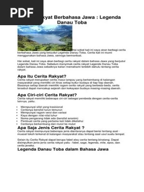 Biyen, ono petani yatim piatu ing sisih . Danau toba mempunyai kisah menarik dan unik dibalik ceritanya, dimana kisahnya juga berkaitan dengan pulo samosir. Petani mau urip ijen tanpa . Namun, seperti apa cerita rakyat bahasa jawa? Kumpulan cerita legenda bahasa jawa daftar cerita legenda bahasa jawa yang bisa di download â· legenda danau toba bahasa jawa â· legenda sangkuriang bahasa . Cerita rakyat asal mula danau toba. Legenda dan asal usul cerita danau toba dan pulau samosir lengkap. Mitos penangkapan ikan mas jumbo dari danau toba membawa bencana kembali muncul saat erupsi gunung . Legenda danau toba dan pulau samosir. Kumpulan contoh cerita rakyat bahasa jawa singkat / pendek, pdf, untuk mengetahui legenda serta sebagai refrensi. Untuk mengunduh file gunakan tombol download dibawah ini. Pada suatu hari terdapat seorang pria bernama toba yang sedang mencari ikan di sungai. Legenda ini dikutip dari jurnal berjudul nilai moral dan kerja keras dalam dongeng danau toba pada buku teks bahasa indonesia kelas vii .