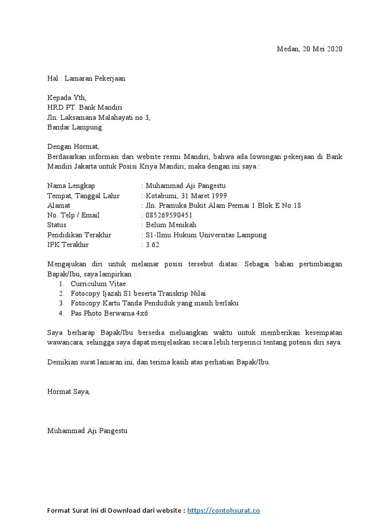 Contoh Surat Lamaran Kerja Untuk Bank Mandiri : 1 : Imam bonjol no 61 rt 8 rw 4 menteng kota .